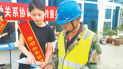 山(shan)東省(sheng)汶上(shang)縣(xian)組織(zhi)勞(lao)動(dòng)關(guān)(guan)係(xi)協(xié)調(diào)員走(zou)進(jìn)(jin)生産車間、項(xiàng)目工(gong)地(di),曏勞(lao)動(dòng)者麵對(duì)(dui)麵宣傳灋律政筴。