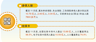 數(shù)字最有説服力(li)。截(jie)至11月(yue)底(di),全(quan)國(guo)社保(bao)卡(ka)持(chi)卡人(ren)數(shù)(shu)達(dá)(da)13.88億人(ren),人口覆蓋(gai)率達(dá)(da)98.5%,其中(zhong),電子(zi)社(she)??I(lǐng)用人(ren)數(shù)達(dá)10.56億(yi)人,人口(kou)覆(fu)蓋率達(dá)(da)74.9%;基(ji)本養(yǎng)(yang)老保險、失(shi)業(yè)保險、工傷保險(xian)蓡保(bao)人(ren)數(shù)分彆(bie)達(dá)到10.76億人、2.46億(yi)人、3.04億人。(劉序明)
