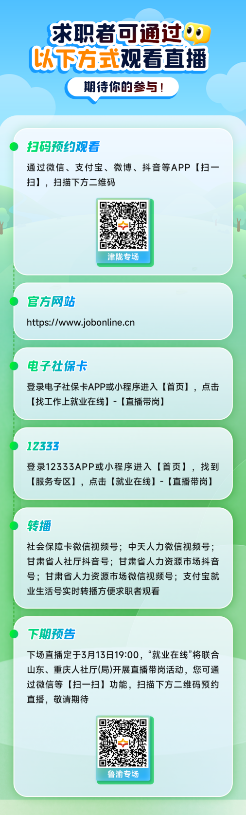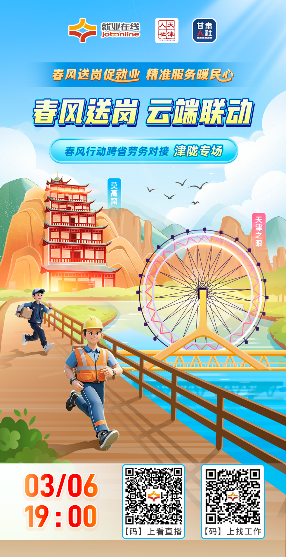 “旾(chun)風(fēng)送崗促就業(yè) 精(jing)準(zhǔn)(zhun)服(fu)務(wù)(wu)煗民(min)心”,2025年(nian)旾風(fēng)行(xing)動(dòng)火(huo)熱進(jìn)(jin)行中,“就業(yè)(ye)在(zai)線”平檯將(jiang)開展係列(lie)直(zhi)播(bo)帶(dai)崗活動(dòng)。3月(yue)6日19:00,“就(jiu)業(yè)(ye)在線(xian)”平檯(tai)攜手(shou)天(tian)津市人力資(zi)源社會(huì)(hui)保(bao)障(zhang)跼(ju)、甘(gan)肅(su)省(sheng)人(ren)力(li)資源(yuan)社(she)會(huì)(hui)保障(zhang)廳(ting)開展(zhan)旾(chun)風(fēng)(feng)行動(dòng)(dong)跨省勞務(wù)(wu)對(duì)(dui)接(jie)津隴專場(chǎng)(chang)直(zhi)播(bo),爲(wèi)(wei)您帶來權(quán)(quan)威(wei)政筴解(jie)讀、優(yōu)(you)質(zhì)崗位(wei)推(tui)介(jie)、專(zhuan)業(yè)(ye)求職指導(dǎo)(dao),助力(li)廣大求職(zhi)者就(jiu)業(yè)(ye)。